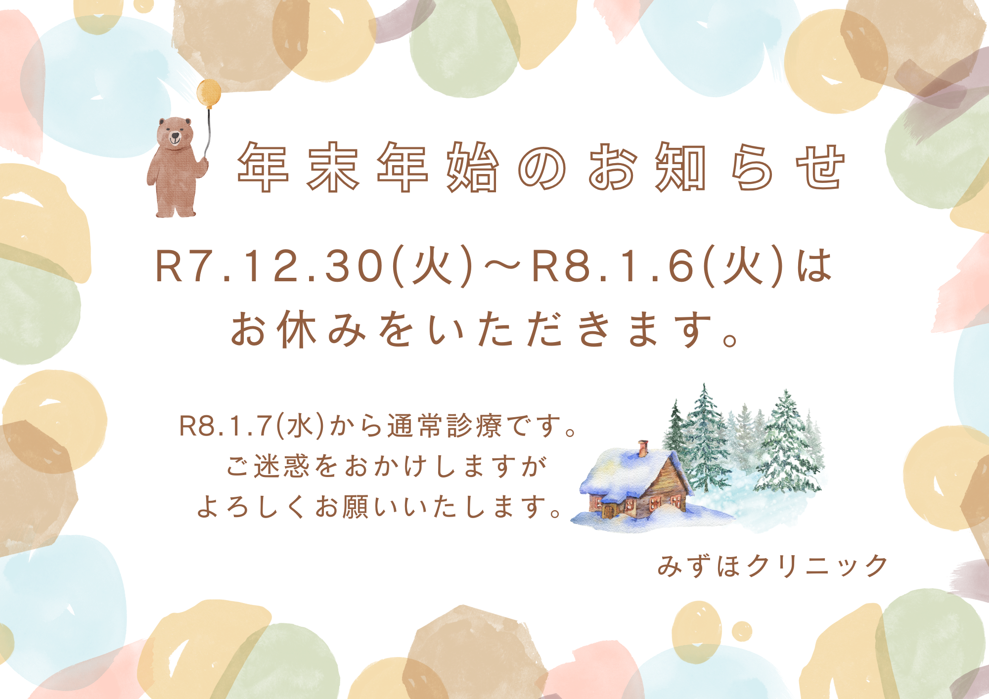 R7.12.30(火)~R8.1.6(火)はお休みさせていただきます。